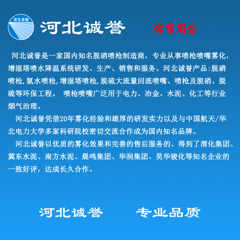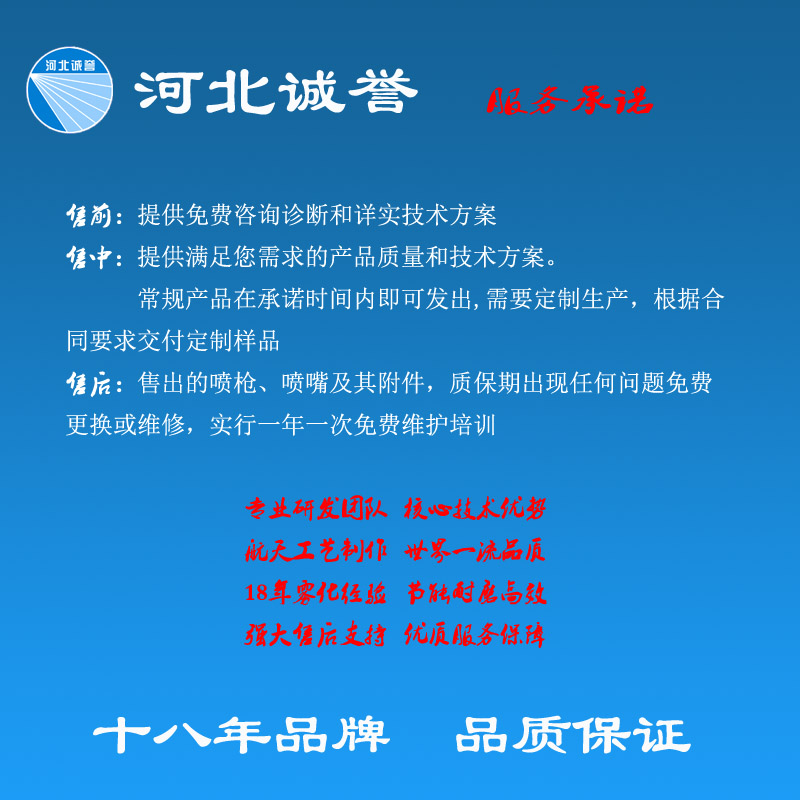 (2)增濕塔噴槍選用規(guī)范不銹鋼及耐磨合金,通過特殊加工工藝制成,具有耐酸、耐堿、耐高溫、耐磨損,使用壽命更長(zhǎng)等特點(diǎn)。其霧化角度從30-110度,流量從110kg/h到1600kg/h,可滿足各種規(guī)劃生產(chǎn)線的需求。